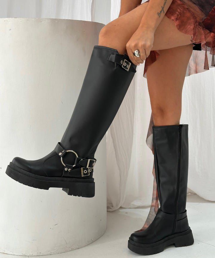 Las Ginebra son ese básico con actitud que transforma cualquier look. De caña alta y silueta estructurada, estilizan la pierna y suman a cualquier look. Están confeccionadas en eco cuero, con acabado levemente brillante que realza el diseño. Los detalles de hebillas metálicas aportan personalidad y un estilo bien marcado.