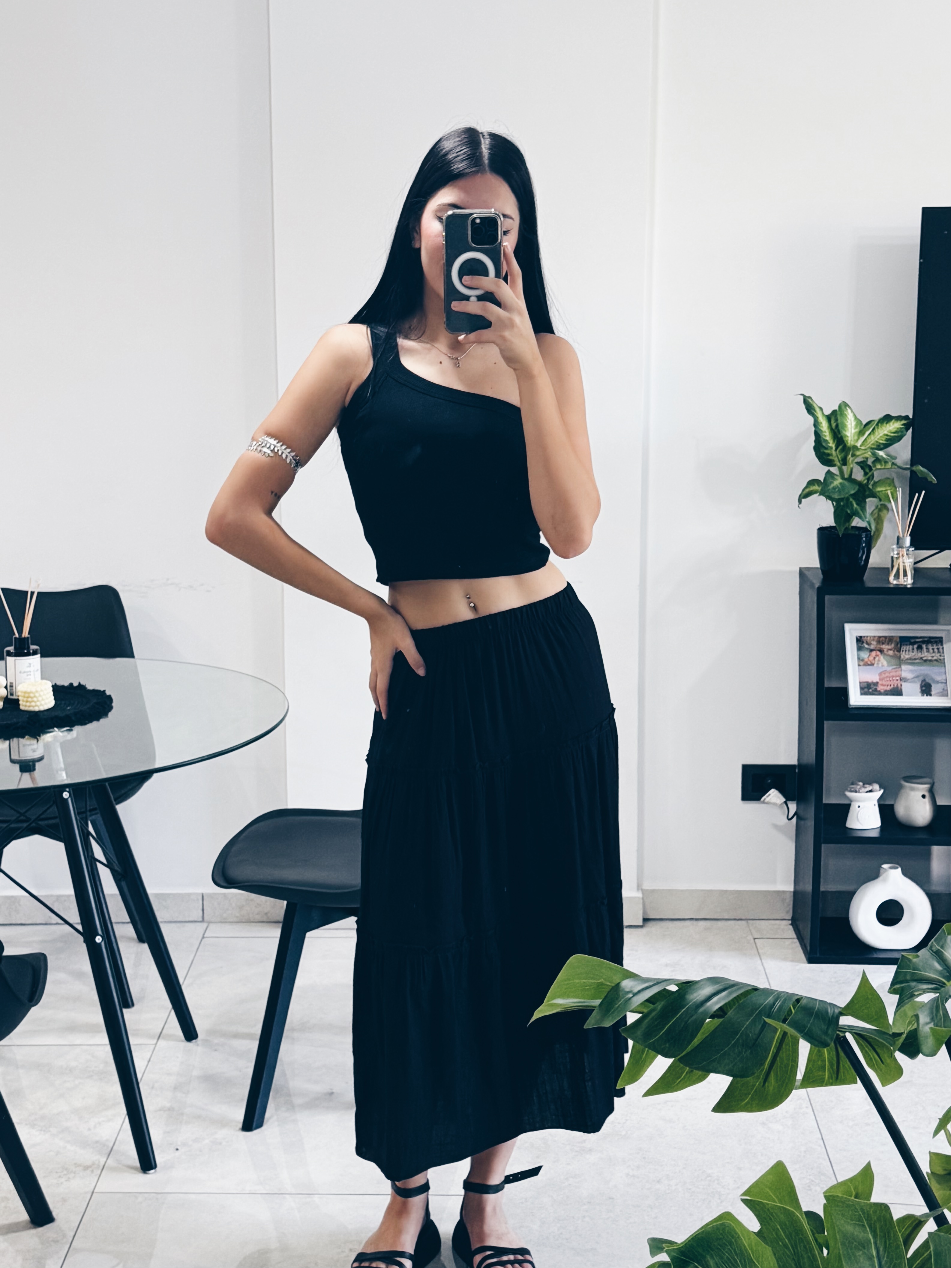 La Falda Albere es una opción fresca, liviana y súper cómoda gracias a su estilo tipo lino. En color negro, combina con absolutamente todo y se adapta a distintos looks, desde los más relajados hasta los más arreglados. Su diseño permite usarla tiro alto o tiro bajo, según el estilo que más te guste o el outfit que quieras armar. Ideal para el día a día, vacaciones o cualquier plan donde quieras verte linda y sentirte cómoda.