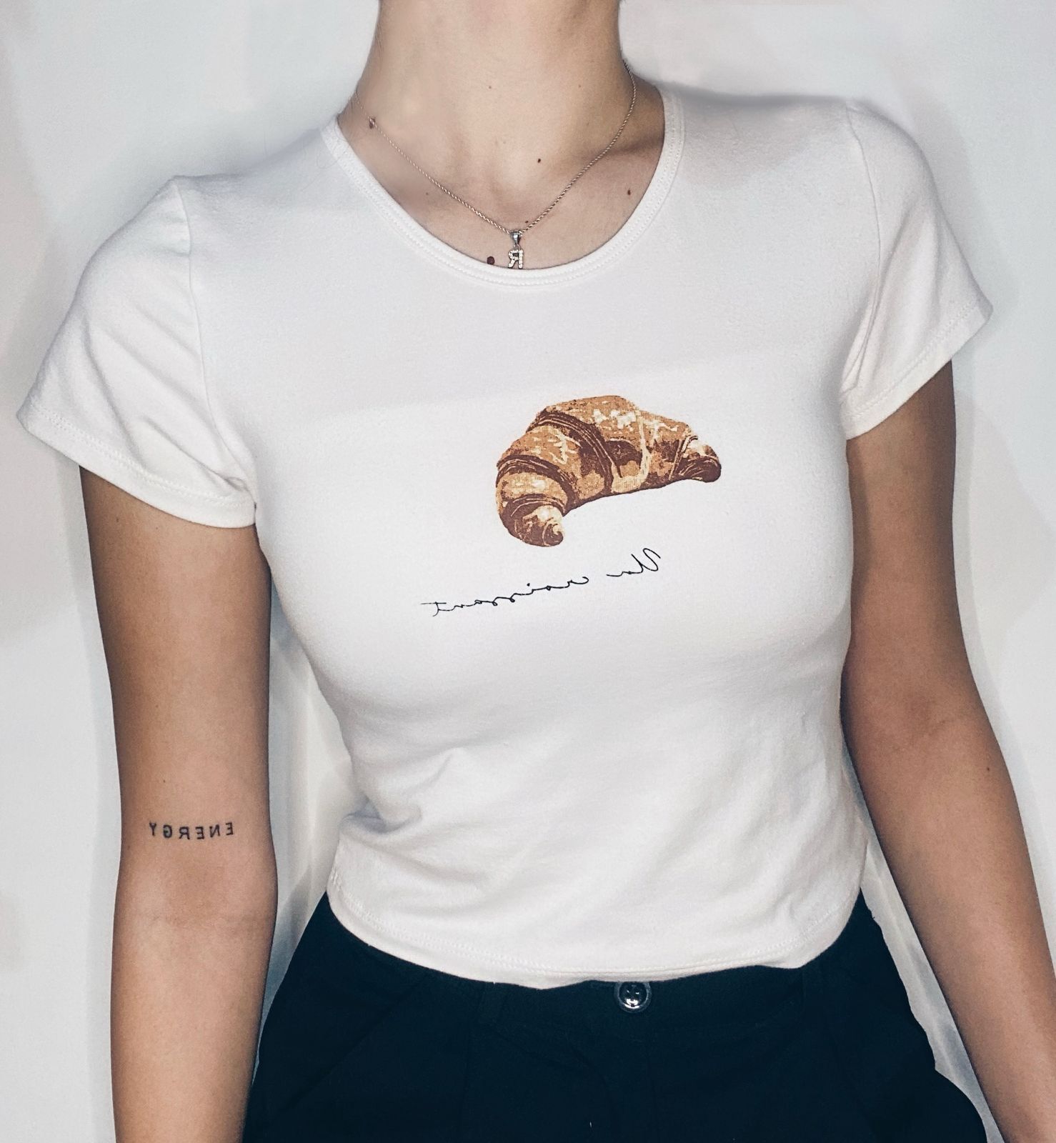 Remera de algodón, suave y cómoda, con una estampa de croissant estilo parisino que la hace hermosa, delicada y súper canchera. Ideal para looks casuales con un toque femenino y chic.