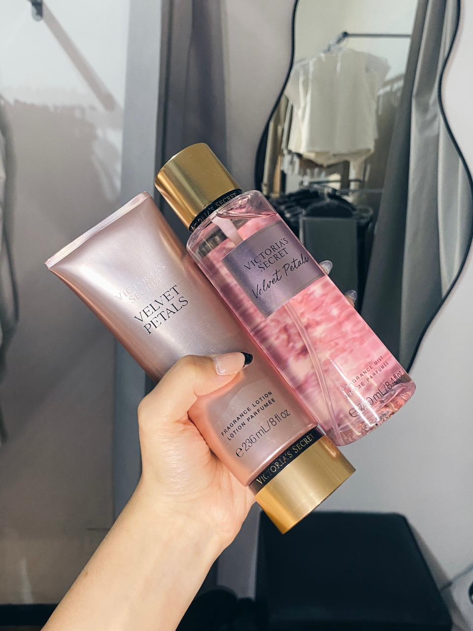 Suave, femenino y súper delicado. El set Velvet Petals de Victoria's Secret es perfecto si te gustan los aromas florales con un toque dulce y cremoso. Incluye: Body Splash (perfume) y Body Lotion (crema hidratante perfumada). Su fragancia combina pétalos florales suaves con un fondo dulce tipo almendrado, creando un aroma elegante, cálido y muy envolvente sin ser pesado. La loción hidrata y deja la piel aterciopelada, mientras que el body splash potencia el perfume para que te acompañe durante todo el día.