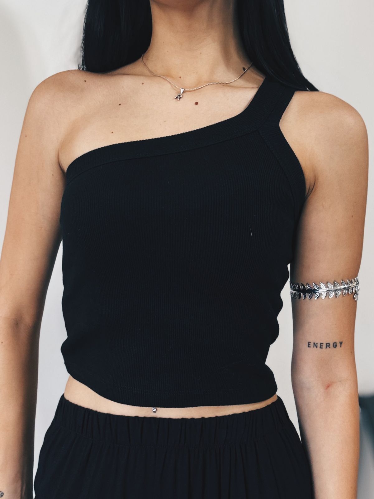 Top negro elastizado con diseño de un solo hombro, súper canchero y moderno. Su tela acanalada se adapta al cuerpo y es muy cómodo para usar todo el día. Un básico con estilo que podés combinar fácil con jeans, faldas o pantalones para un look casual o más arreglado.